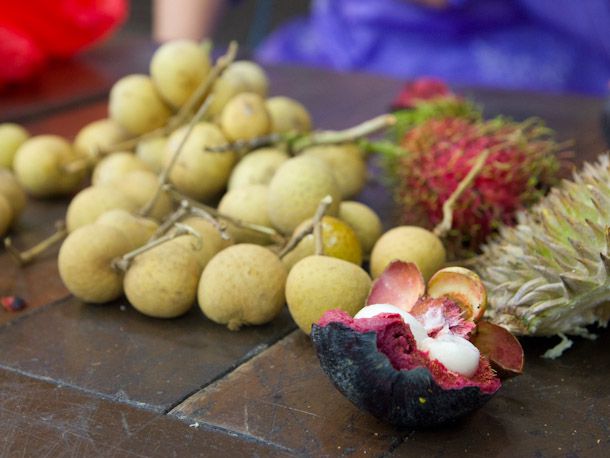 Whether eaten straight, blended into juice, or used as a topping in a shaved ice dessert, a wealth of tropical fruit is an important part of the Singaporean diet. There is, of course, the famously stinky durian, which Singaporeans can't get enough of. The durian I've had in the U.S. has always had a rotting flesh flavor with hints of almond and overripe apricot; in Singapore it's even more intimidating. The custardy fruit boasts a hot, brash kiss of garlic breath that more than once stopped me in my tracks.