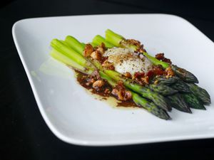 Asparagus with Bacon-Hazelnut Vinaigrette and Slow-Cooked Egg Recipe