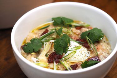 So how do you make a super-creamy soup with no cream at all? There are a couple of ways to get there. Sometimes I'll use bread to thicken my soups, as in this 15-minute tomato soup. The other technique is using a classic French preparation called velouté. The word comes from the same root as velour, and, just like a neon velour tracksuit, velouté is smooth, suave...let's just go with velvety and bright.
