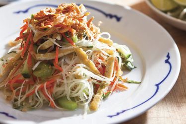 The classic flavors of Vietnamese banh mi sandwiches are reworked into the form of Italian panzanella, a salad designed to make stale bread delicious again. This version features pickled and fresh vegetables, lemongrass-marinated tofu, and two sauces that deliver spicy, sweet, and savory flavors.
