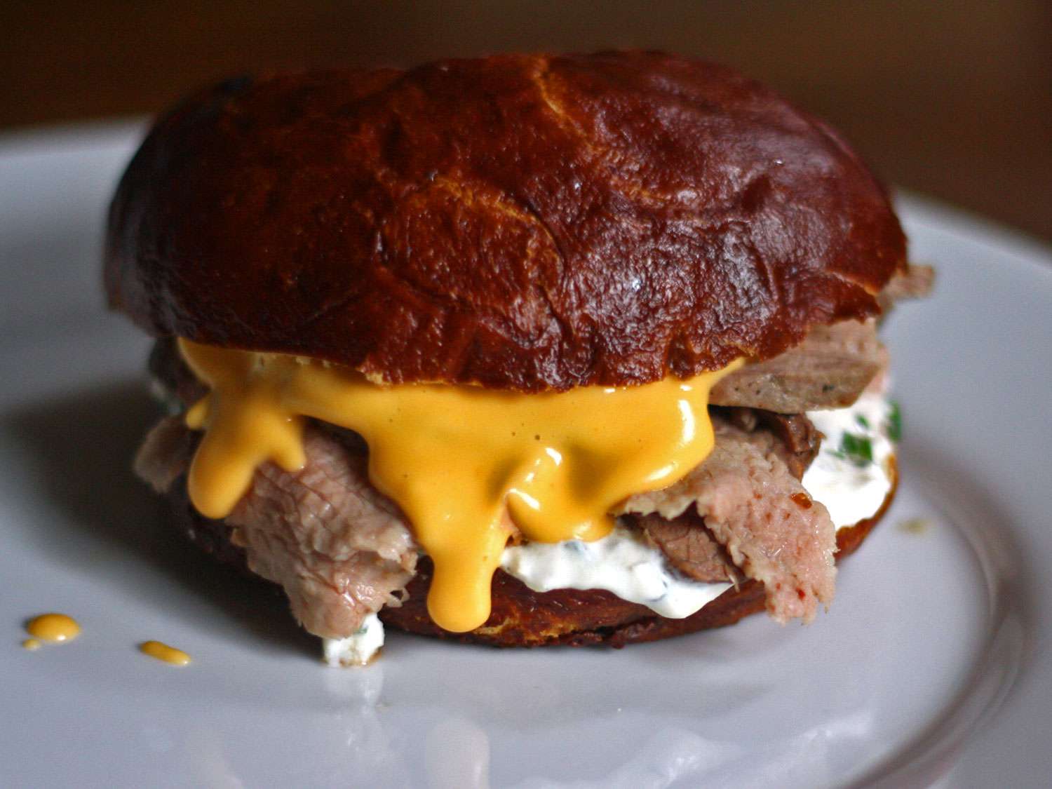 Smear the cut-side of the bun bottoms with horseradish sauce, and top each with 1/4-pound of the sliced meat. Drizzle with some of the cheddar sauce and then crown with top bun halves. Serve immediately.