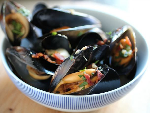 Pour the finished sauce over the mussels, then sprinkle on the reserved bacon, as well as the chopped parsley. Serve the mussels with crusty bread and cold beer.