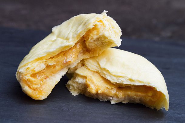 The mashed pumpkin in these steamed buns isn't anything like pumpkin pie filling; expect milder mashed squash, perhaps brightened with condensed milk, but not a spiced eggy custard. Great Bakery makes the only baked version we could find, filled with squash enhanced by just a touch of sugar. On the sweeter end is Golden Steamer's excellent steamed version, which hews closer to dessert than afternoon snack.