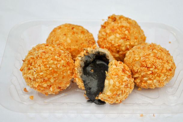 Our third favorite is really a tang yuan, a rice flour dumpling, from the restaurant A-Wah. The dumplings are filled with black sesame paste and usually served in hot, sweetened water, but at A-Wah you can request them without the broth. The dumplings, coated in crusted peanuts, have a warm sesame filling that oozes with every bite.