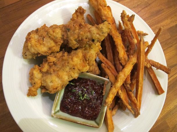 Buttermilk-Thyme Chicken Tenders with Cranberry Mustard and Sweet Potato Fries Recipe
