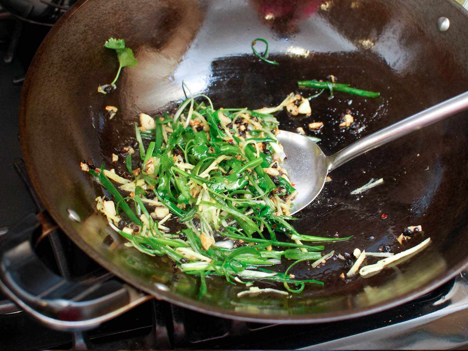 While it's resting, I quickly whip up the topping, cooking the garlic and fermented black beans, then tossing in thinly sliced scallions, ginger, cilantro, and chile flakes.