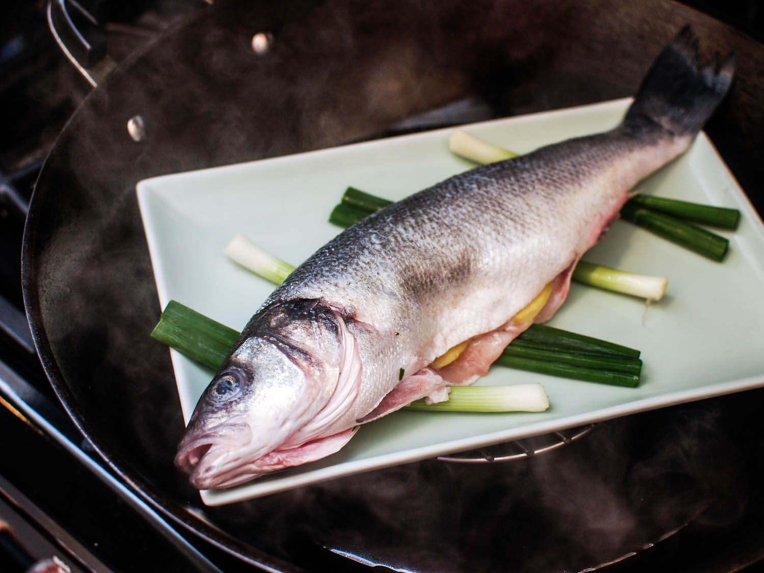 Set halved scallions on a heatproof plate large enough to hold the fish, while small enough to fit inside steamer. Set fish directly on top of scallions so that the scallions mostly keep fish from making direct contact with the plate.