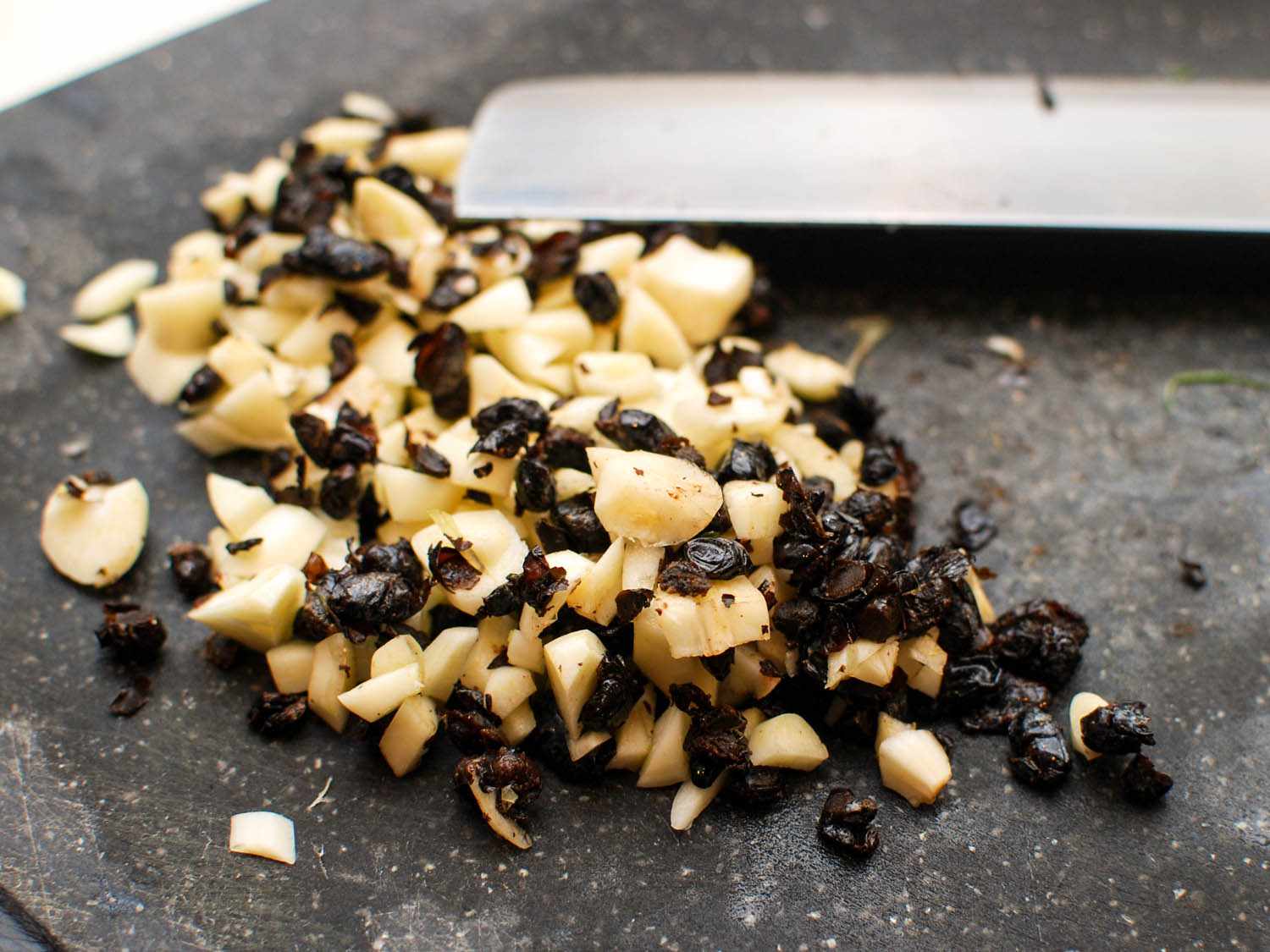 Combine black beans and garlic cloves on a cutting board and roughly chop them together.