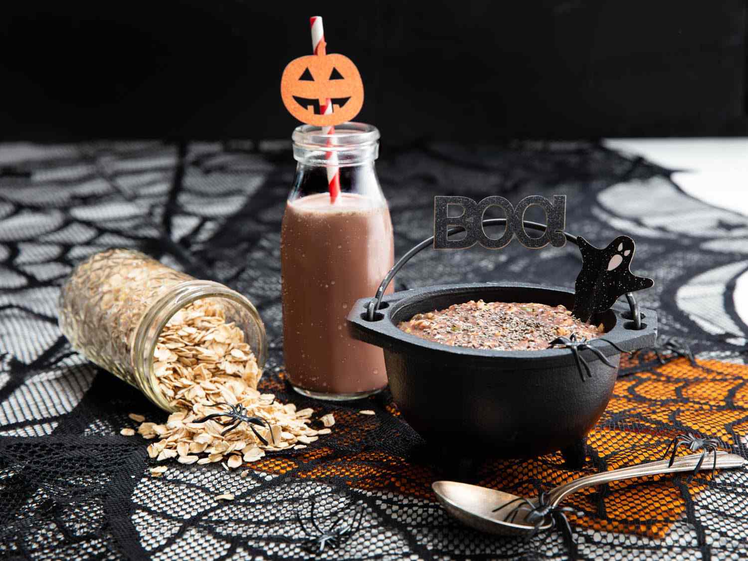 Depending on how sweet your chocolate milk is, you may opt to add a dash of maple syrup, but it’s plenty good without it. Pumpkin seeds add a nice crunch if you like, or you could throw in any other seeds or nuts you prefer. And, if you want to get extra spooky, you could add some peeled grape "eyeballs," or stick in half a banana with little ghost eyes and mouth made from dots of chocolate syrup. A chocolate-syrup cobweb, perhaps? Whatever you do, have fun.