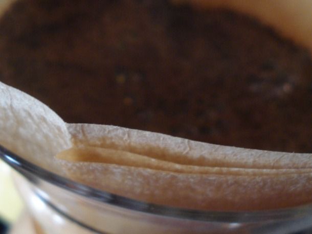 To prevent that dusty tragedy, take the filter and, holding it open from the bottom fold, dip it upside down into a dish or bowl full of hot water. Alternately, to save time you can soak several filters at once time in a hot-water bath, using one and setting the other clean ones aside to try for future brews.