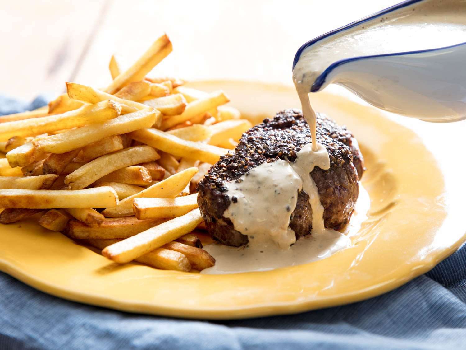 This is another one of those French classics I tackled this year, and I was surprised at the tweaks I found to make the recipe, I believe, better. First I introduced a dry-brining step, which makes it possible to both season the steak and get the peppercorns to adhere to it (if you put the salt on right before cooking, the pepper won't stick), leading many chefs to add the salt after the peppercorns—in which case the salt doesn't stick! I also decided to only encrust one side of each steak with the pepper, allowing the other side to sear and develop a good fond in the pan that otherwise wouldn't happen with a layer of pepper in the way. That omitted portion of pepper, meanwhile, doesn't get lost: I bloom it in hot fat to develop its flavors, then work it directly into the pan sauce. Result: best of all worlds.