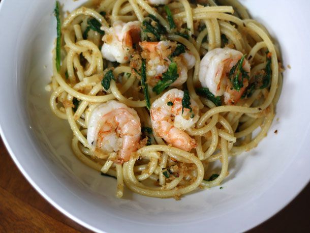 Bucatini with Spicy Shrimp, Arugula, and Breadcrumbs Recipe