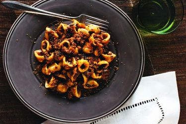One bite of this dish proves that there is a lot going on. At its base, this dish is about the interplay between sweet, plump shrimp and spicy red pepper flakes. The latter is cooked with sliced garlic until it perfumes the oil, so that every bite has its slight spark. Sure, the duo makes for a good start, but it's not quite enough to carry the whole dish. Add arugula for some bitterness and for some crunch, sprinkle in some bread crumbs, which are cooked gently until they turn golden brown and crispy.