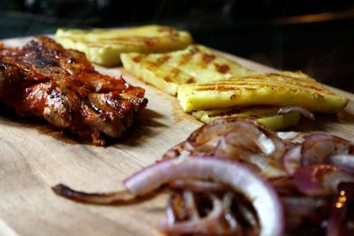 Set a large grill or grill pan over medium-high heat. Toss on the meat, onions, and pineapple. Cook the meat for about 2-3 minutes a side. Cook the onions and pineapple, turning occasionally, until they are soft, about 6-8 minutes. Transfer everything to a cutting board.