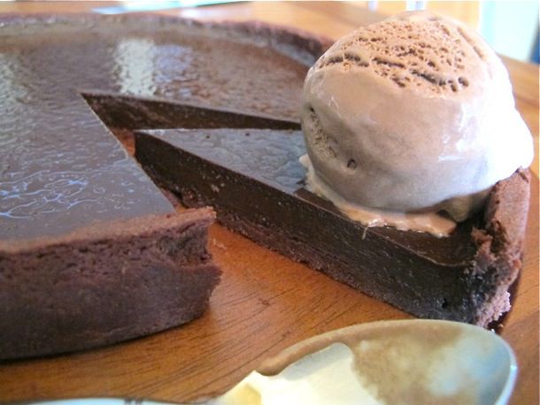 This dessert is a chocoholic's dream: chocolate filling, chocolate shell, and a topping of chocolate ice cream.