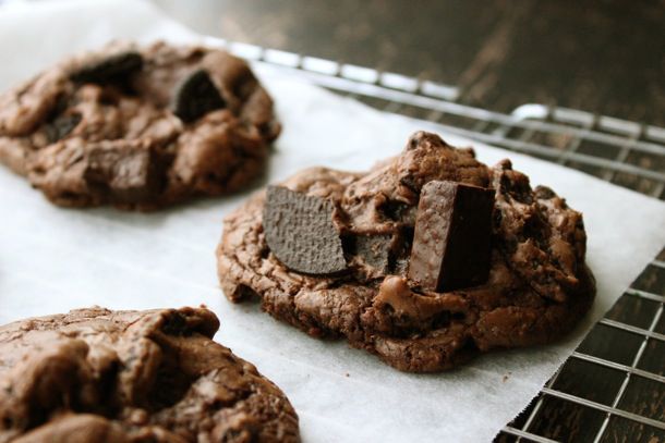 Notes: I used Oreo cookies with the filling scraped out, but Nabisco Famous Wafers are my first choice. Instead of folding in all of the remaining chopped chocolate, you can set aside some of it to press into the tops of the dough balls just before baking.