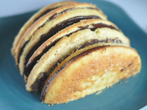 To Assemble the Cake: Using a sharp knife, carefully split the cooled cake layers horizontally so that you have four full layers. Stacking the layers on top of each other, cut the layers about 3/4 inch off center so you have four large pieces and four smaller pieces.