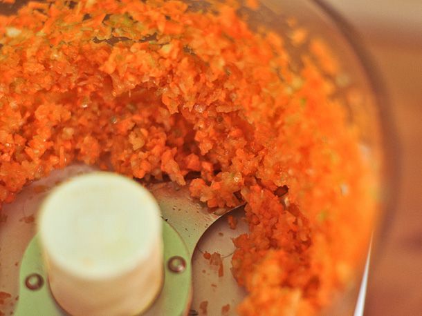 In food processor, pulse carrot until broken into rough 1/4-inch pieces, about five 1-second pulses. Add celery and onion; pulse until all vegetables are broken into 1/8-inch pieces, about five 1-second pulses.