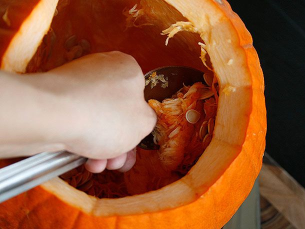 Before you can begin carving and detailing, you'll need to scrape out the interior of the carving face to a relatively thin, even thickness. About three-quarters of an inch is ideal. Forget the dinky plastic spoons that are marketed this time of year as pumpkin scrapers. Instead, stick with a stiff stainless steel serving spoon. You can go fancy with something like this Cuisinart stainless steel serving spoon, or just do what I did and get a generic one for about $5 at any kitchen supply store. Choke up on the handle until your hand is basically touching the bowled end, and scrape away pumpkin flesh in record time.
