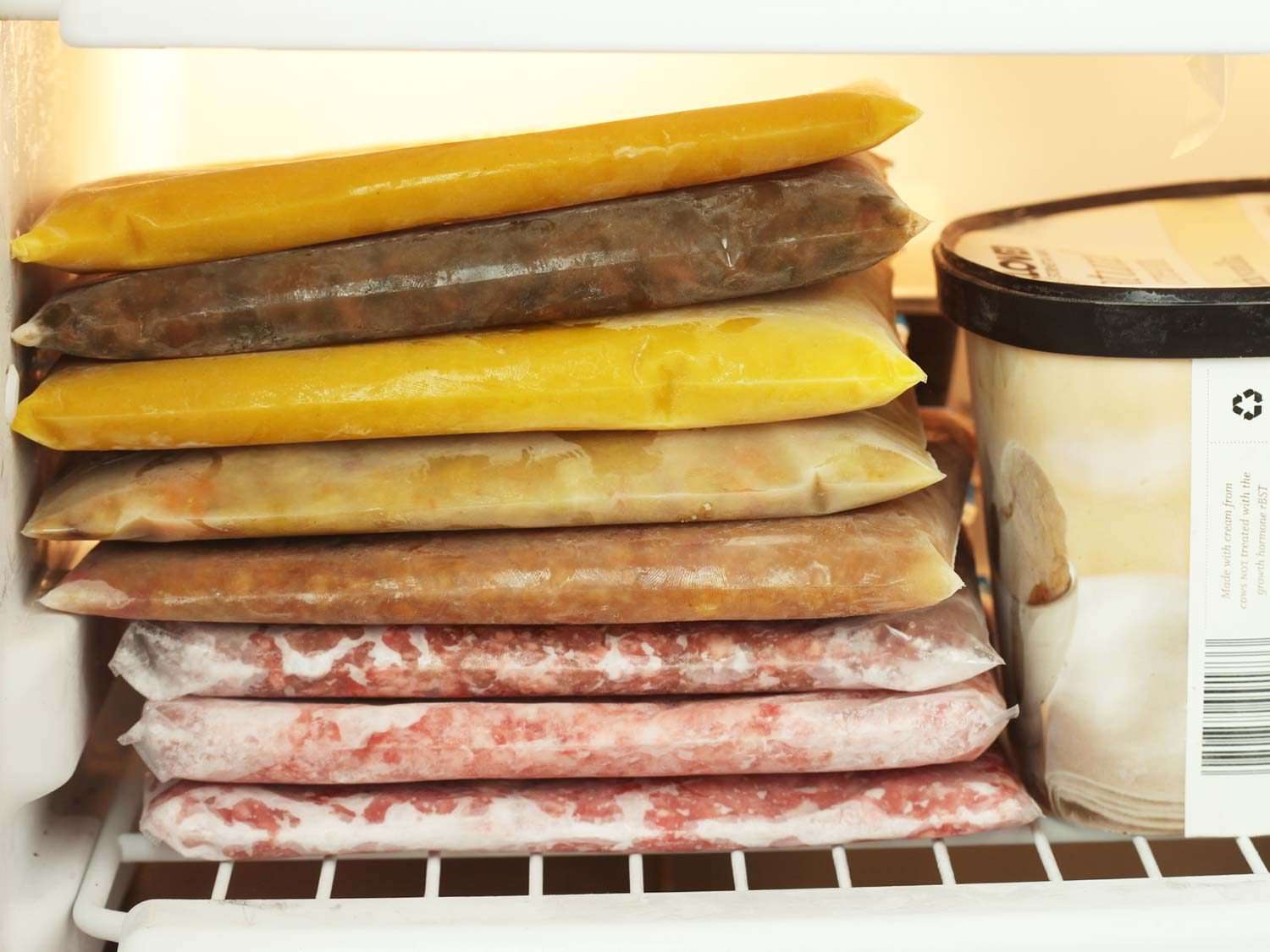 One more freezer trick: freeze things flat and stack them. Whether it's soups, stews, or ground meat, the flatter and wider you can get them, the faster they'll freeze and defrost, which not only makes you more efficient, it also improves the quality of the food (the longer something takes to freeze, the more cellular damage it will suffer).