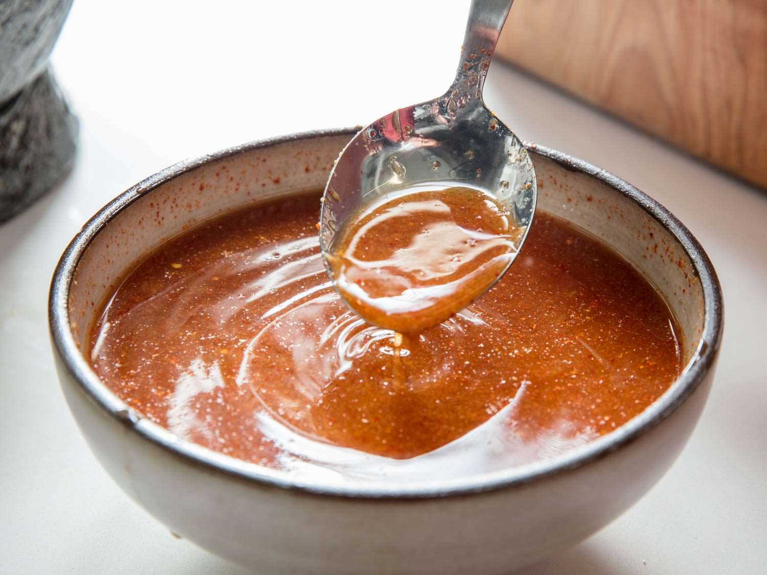 Finally, I whisk in a couple of tablespoons of toasted-rice powder, which thickens the sauce and gives it a nutty, toasty background flavor. This sauce will keep for a week, so you can make it well ahead of your dinner party. Just make sure you bring it to room temperature and stir it to redistribute the rice powder, which will settle at the bottom, before serving.