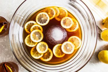 Speaking of ice, you should make it just a few days before the feast. You can freeze a big, festive block in a Tupperware or bundt pan full of water (use filtered if you generally prefer the flavor), then dip it in warm water to release the block—just double check first that the container will fit in your serving vessel along with those 9 cups of liquid. Don't use months-old ice; it tends to absorb the unpalatable odors in your freezer.