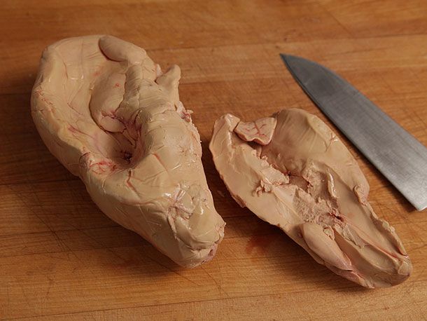A whole foie gras can be split easily into two lobes. Use your hands to pull them apart. Work quickly so that the foie gras stays relatively cool and solid. It softens quickly and can smear if it gets too warm.