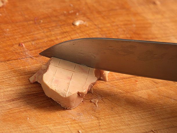 Duck skin is often scored lightly in order to prevent it from shrinking and causing the duck breast to curl up. With foie gras, there is no technical reason to do this as it does not buckle like a duck breast, but the practice continues, mainly for appearances. I score one side—the side I'm going to serve facing up—in a light cross-hatch pattern.