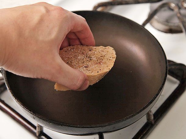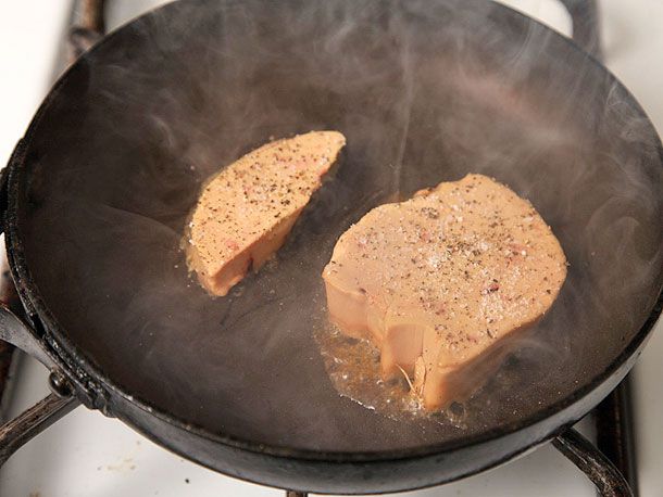 Heat a very hot cast iron, stainless steel, or high heat-safe nonstick skillet over high heat for at least a few minutes before placing the foie in it, scored-side down. It should immediately start smoking and sizzling. If not, quickly remove it and let the pan get hotter before trying again.