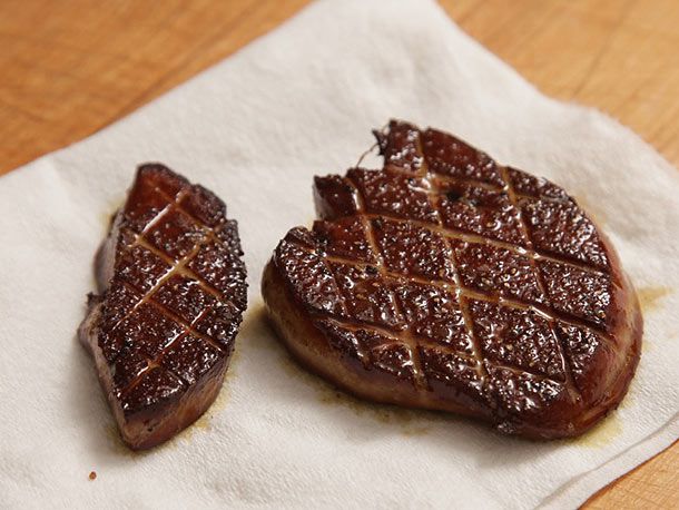 Transfer the foie gras to a paper towel-lined plate or cutting board and let it rest for about a minute. During this time, the interior should be warm and soften completely.