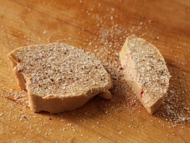 Season the foie gras very liberally with salt and pepper. Much of the seasoning will come off and float away as the fat renders, so it's important to go heavier than you believe is necessary.