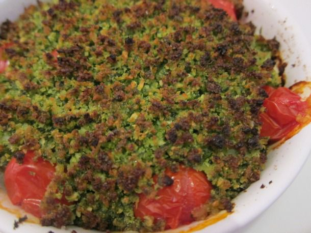 This is the perfect easy, elegant dinner—so easy and elegant, I made it just for myself. Nestle sea scallops and little tomatoes in a gratin dish, then simply cover them with a quickly blitzed crumble of breadcrumbs, garlic, basil, and, of course, butter. While it bakes in the oven the garlic heats up and perfumes everything beneath it, the scallops and tomatoes relinquish all their sweet juices, and the basil toasts. It's glorious.