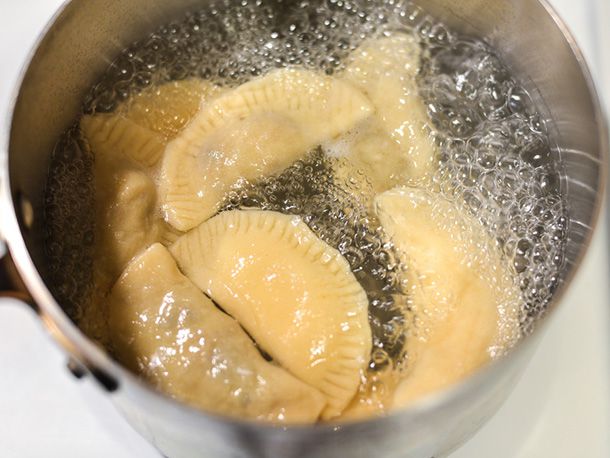 Note: Pierogi can be made through step 5 and frozen for later use. To freeze, place on a parchment-lined baking sheet and place in freezer until fully frozen, about 1 hour. Transfer pierogi to a zipper-lock freezer bag and store for up to 3 months. Cook directly from frozen as directed from step 5.