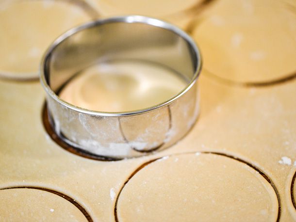 Roll dough out on a lightly floured surface into a large sheet approximately 1/16-inch thick. Cut out rounds using 3-3 1/2-inch biscuit cutter. Remove excess dough, shape into a ball, re-roll, and wrap in plastic.