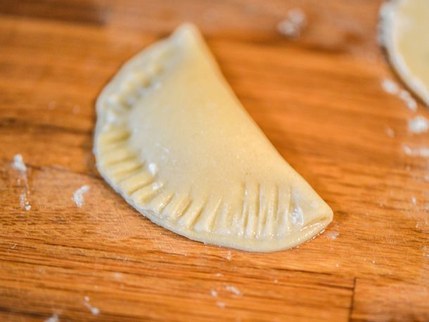 Place 1 heaping teaspoon of filling in center of each round. Brush edges of round with water, fold over, and seal wrapper shut by pressing edges down with tines of a fork. Transfer to a tray lined with parchment paper. Repeat steps 4 and 5 with remaining dough and filling