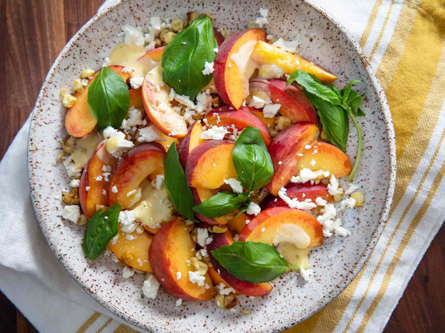 4. Slice peaches into 1-inch wedges and arrange on a plate. Toss roasted corn with lime vinaigrette. Top peaches with corn, feta crumbles, and dollops of honey-lime mayo. Finish salad with Thai basil and a sprinkle of chili powder and fleur de sel.