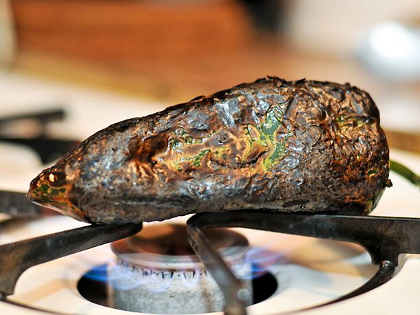 Roast poblanos over an open flame on a gas stove or grill until skins are completely charred. Place in a bowl, cover with plastic wrap, and let sit for 30 minutes. Remove charred outer skins, cut in half, and remove the seeds and cores; finely chop poblanos.