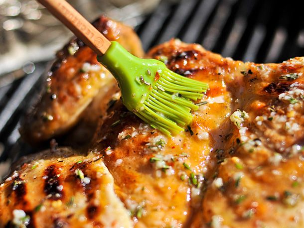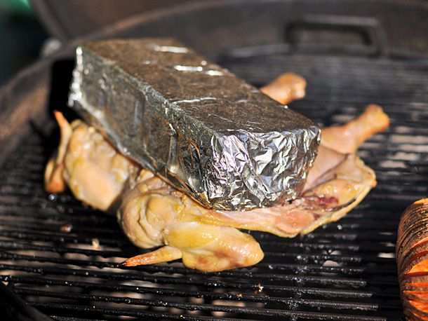 Placing a brick atop a butterflied chicken results in an evenly browned and slightly crisp skin, a great start to an excellent bird. Brush chicken with garlic and rosemary mixture for the perfect marriage of texture and flavor.