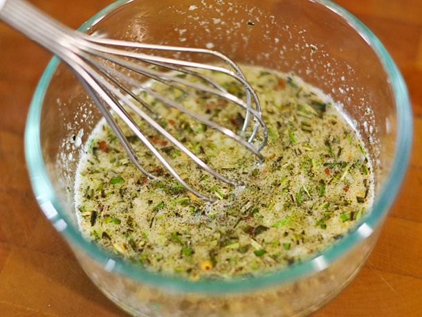 While chicken is brining, place garlic and salt in a mortar and pestle and work into a smooth paste. Transfer to a small bowl and whisk in lemon juice, olive oil, and rosemary. Set aside.