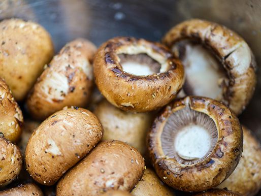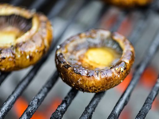 Light one chimney full of charcoal. When all charcoal is lit and covered with gray ash, pour out and spread the coals evenly over entire surface of coal grate. Set cooking grate in place, cover grill and allow to preheat for 5 minutes. Clean and oil the grilling grate. Place mushrooms on the grill, gill side up, and cook until mushroom caps brown and start to release their moisture, 3-4 minutes. Flip and continue to cook until mushrooms are slightly soft, about 3 minutes more. Remove mushrooms to a tray, gill side up, and let cool for 3-5 minutes.