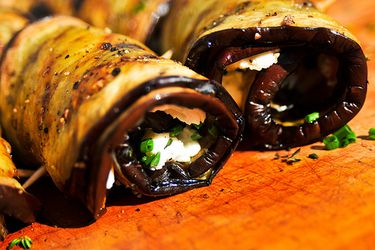A quick and fresh appetizer or side dish, these grilled eggplant rolls get some Greek love thanks to an herbed-packed blend of yogurt and feta. Diced fresh tomatoes and cucumbers add a little contrasting crunch to the creamy filling.