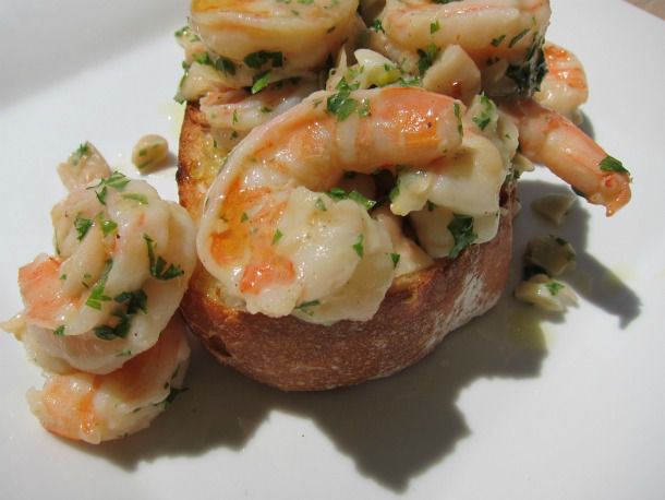 Shrimp Scampi. Old School! It will always be a stalwart standby mountained on top of linguine, but I like this more elegant, updated version. Grill some thick country bread drizzled with olive oil until it's charred (use an oven if you don't have a grill), and rub the hot bread with garlic. Then top it with a 5-minute stew of big, juicy shrimp, creamy, hearty white cannellini beans, white wine, tons more garlic, parsley, cold sweet butter, and even some arugula if you're feeling adventurous. Perfect for two.