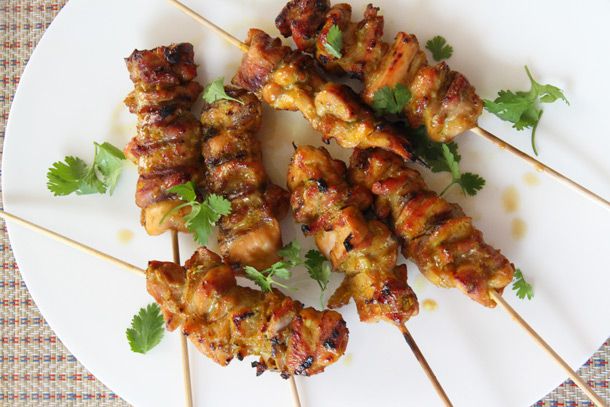 This is a skewered, simpler version of Thai-style turmeric-scented grilled chicken that greatly reduces the time it would take you to grill a whole chicken as traditionally done. The flavor is not compromised, however.