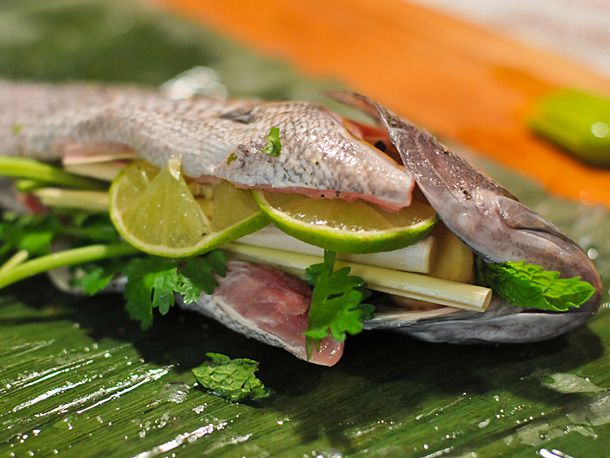 It was for a Vietnamese-inspired cookout menu. I stuffed two fresh black sea bass with lemongrass, cilantro, mint, ginger, and lime, then wrapped the entire thing in a banana leaf and tied it shut with butcher twine.
