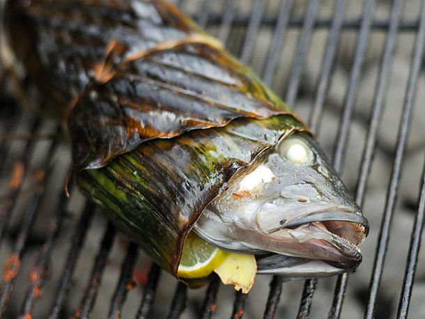 Oil one side of banana leaf and place fish on oiled side. Wrap leaf tightly around fish and tie securely with butchers twine. Repeat with second fish.