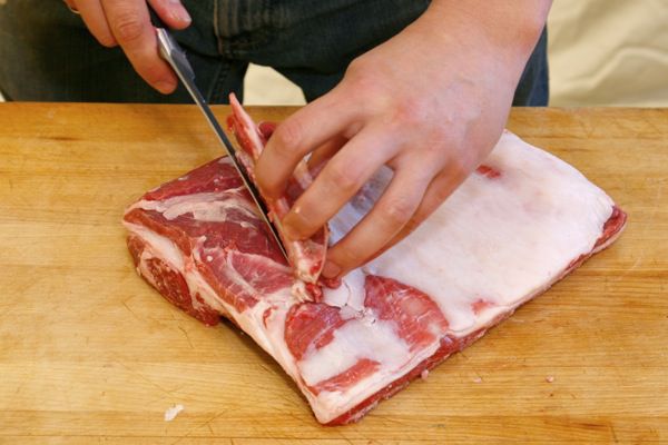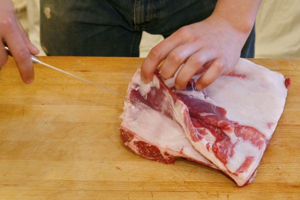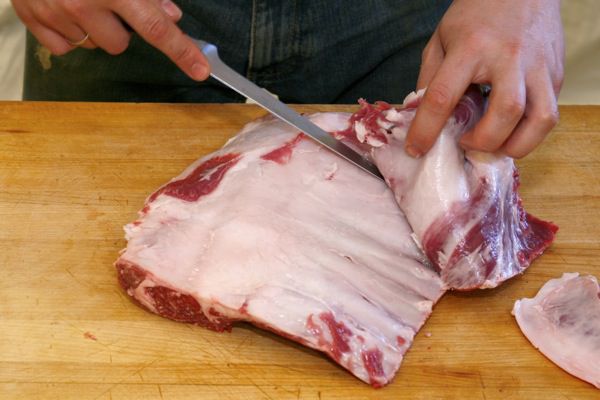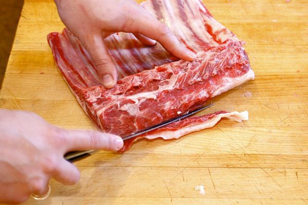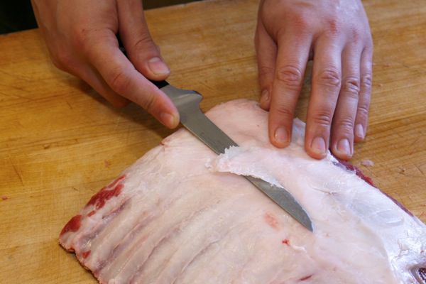 Trim away the thick layer of fat covering the ribs by making a small incision where the shoulder rib was removed at the rib-tip end, and slowly peel away the layer with your non-knife hand. The action is more pulling and separating than slicing.