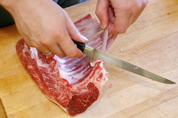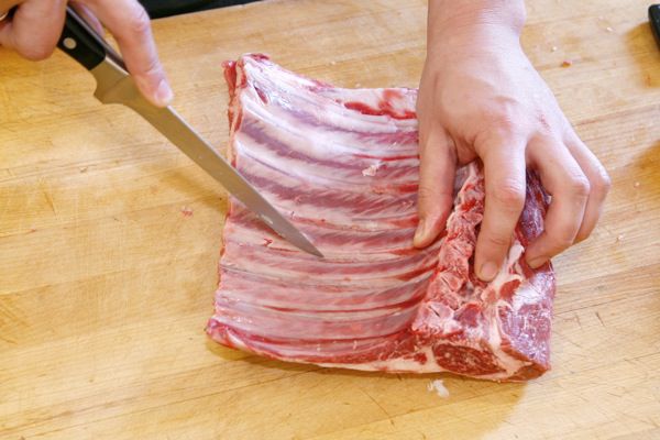 To divide rack into smaller racks or individual chops, stand it on end, and starting from the exposed rib end, cut between ribs with smooth, single strokes. If you don't get through in one stroke, pick up your knife, place it back in the seam, and pull it again—do not saw back and forth. You'll end up with jagged edges.