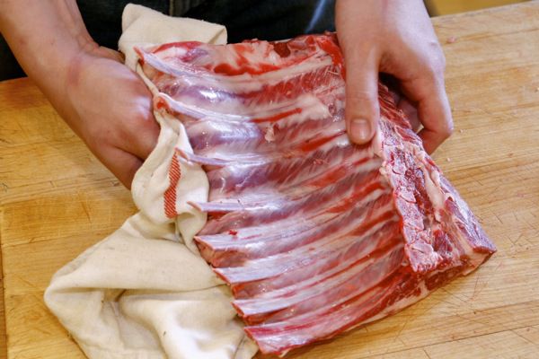 Using a dish towel to grip the slippery fat, pull fat and membrane away from between each rib slowly and firmly. It should pull cleanly away from the bones.