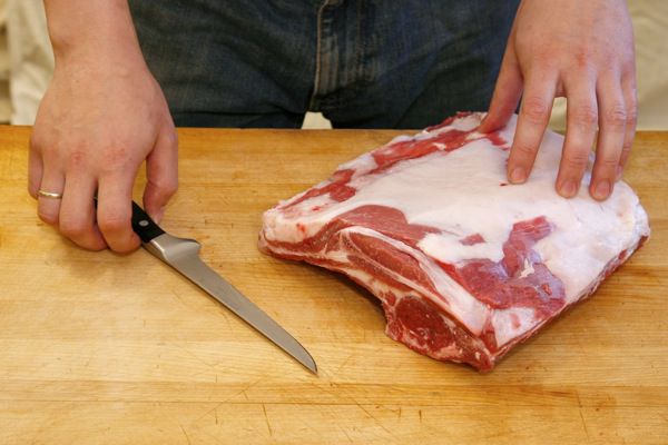 Sometimes, on large racks, the shoulder blade will be left intact. Remove this bone with by lifting with your non-knife hand and cutting underneath it using a butcher's knife or a paring knife. Save bone for stock or pets if desired.