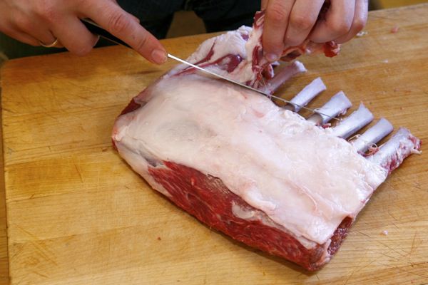 Flip the rack over and use your knife to cut away the flap of fat and membrane. Discard excess fat, or render if desired (rendered lamb fat is great for roasting potatoes or playing practical jokes on your wife).